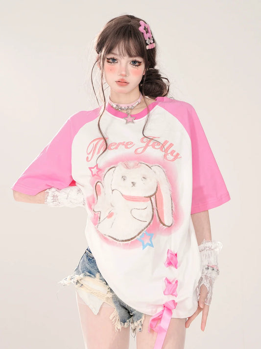 Raglan New T-Shirt Pink Blue Loose Rabbit and Design