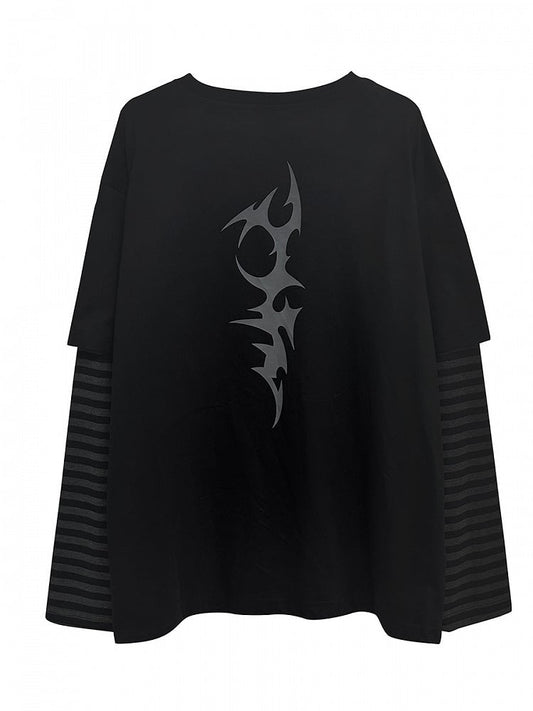 White Dark Kawaii Striped Sleeves Graphic T-shirt