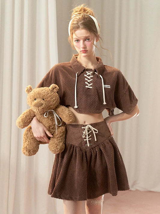 Lace-up Short Top + Flared Skirt + Lace-up Over Polo T-shirt