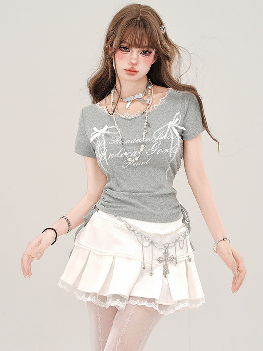 Slim Lace T-Shirt Frill Short Ribbon