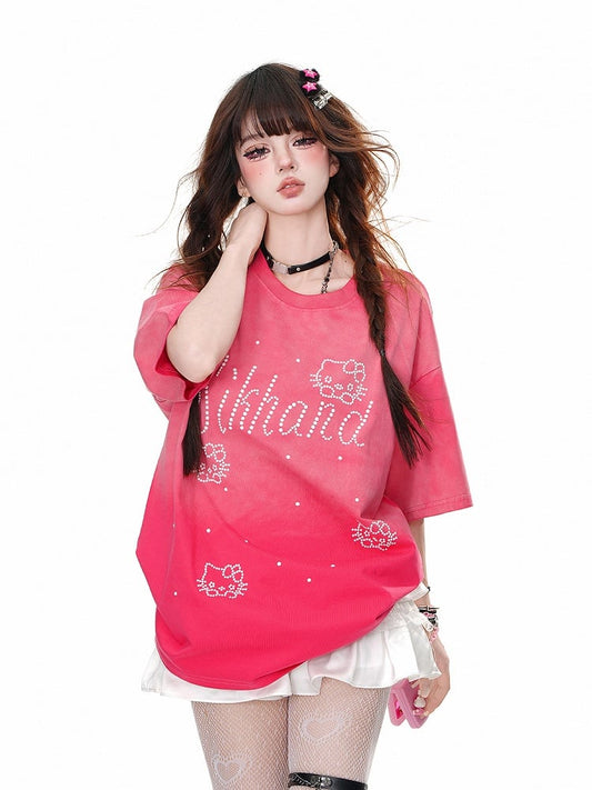 Blue/Rose Red Round Neck Kitty Rhinestone Loose T-Shirt