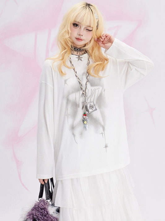White Star Print Loose Long Sleeves T-shirt