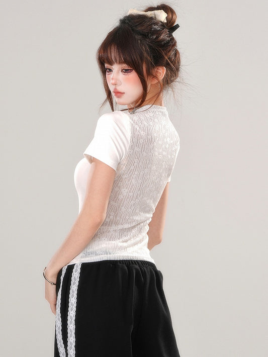 Black/White Butterfly Mock Neck T-shirt Lace Patchwork At Back