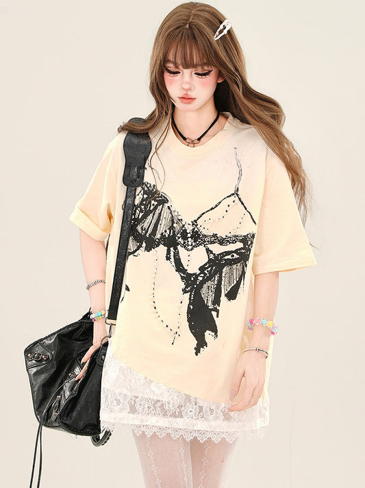 Apricot/Black Bra Graphic T-shirt with Bead Embellishments