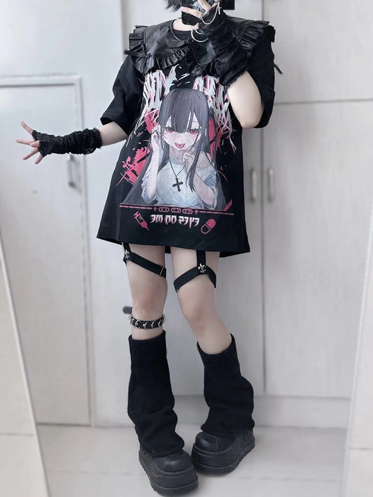 Jirai Kei Black Anime Girl Yami Kawaii T-shirt with Fake Collar Set