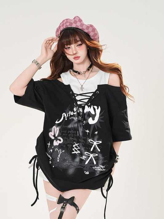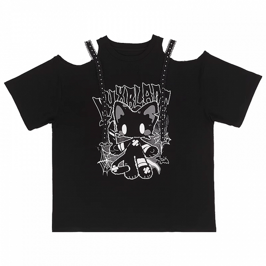 Cat Print Loose T-Shirt Y2K Black Cutout Shoulder Bittersweet