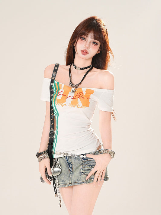 White/Black T-shirt Neckline Letter Print Off-the-shoulder