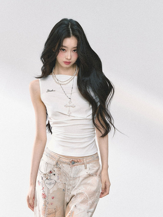 Black/White Slim-fitting T-shirt Round Neck Camisole Print