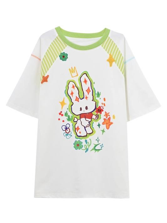 T-shirt White Round Neck Loose Cartoon Bunny Print
