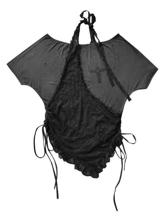 T-shirt Halter Neck Black Cross Rhinestone Curved Hem