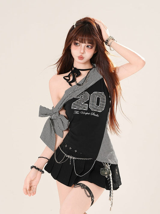 and Y2K Cross Necklace Print White Gray Striped Halter Neck T-shirt