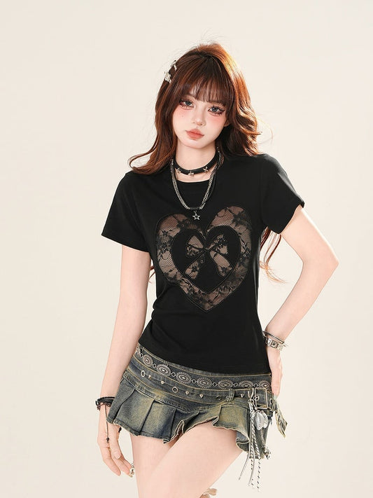 Heart Cutout Lace Black/White Patches Round Neck T-shirt