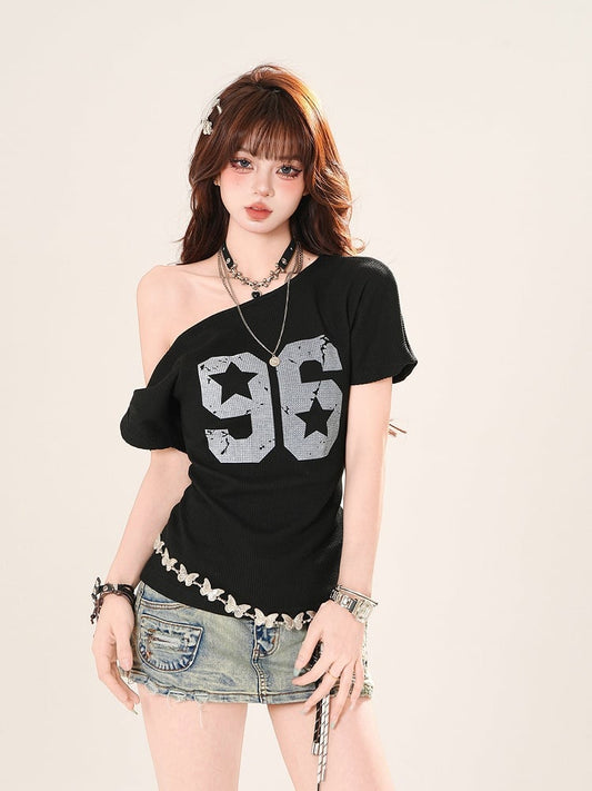 Asymmetrical Neckline Number Print Slim-fitting Black/Coffee T-Shirt