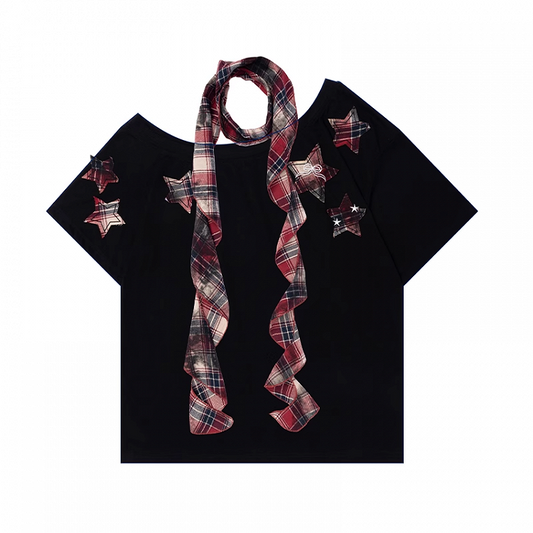 Red Plaid Star Appliques Black Asymmetrical with Neckline T-shirt
