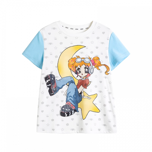 Cartoon Girl Y2K Blue White Colorblock Design Print T-shirt
