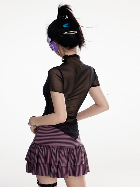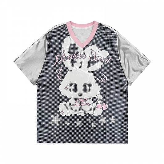 T-shirt Black Mock Neck Mesh Y2K Cute Bunny Print Curved Hem