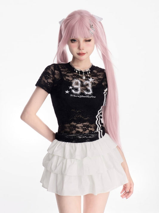 Lace T-shirt Round Neck Number Print Semi-sheer Black/White