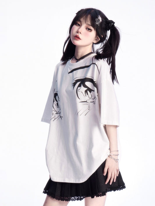 White/Black Round Neck Anime Girl Print Loose T-shirt