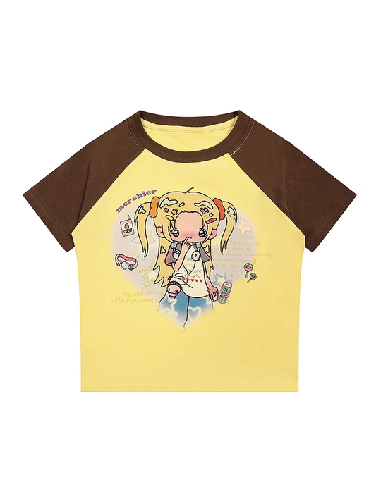 Y2K Yellow Colorblock Design T-shirt Cartoon Print Slim-fitting