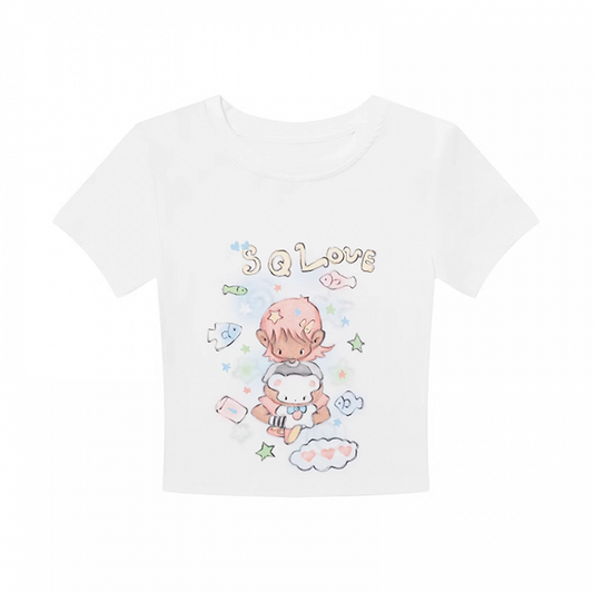 T-shirt Y2K Cartoon Girl Print White Round Neck Slim-fitting