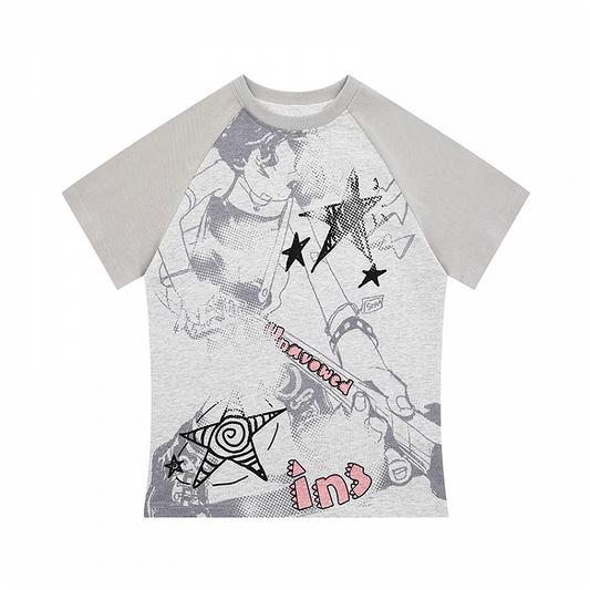 Gray Colorblock Design Y2K Star Print T-shirt and White
