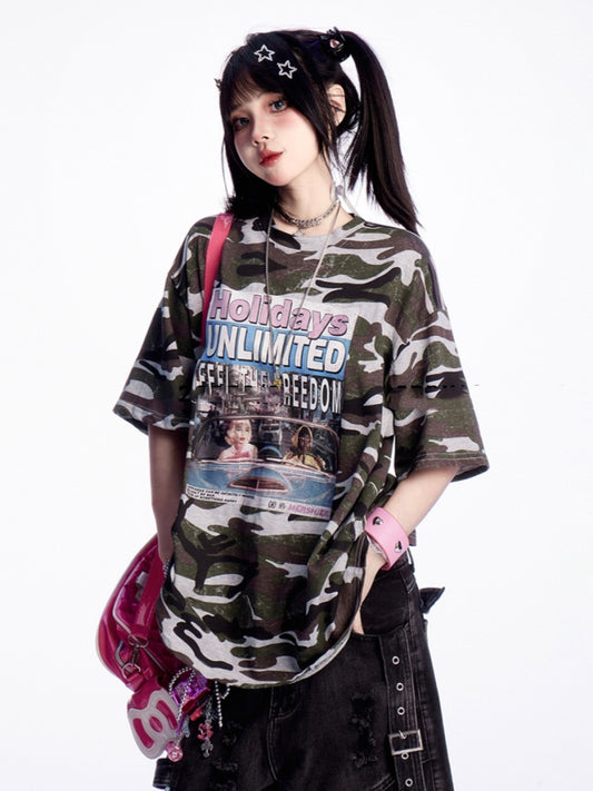 Camouflage Round Neck Letter Print Vintage Loose T-shirt