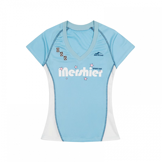 Blue Black and T-shirt Colorblock V-neck Racing Print Loose Design