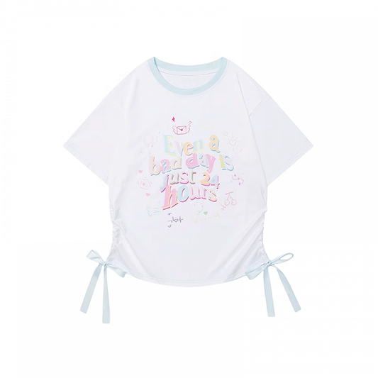 Loose T-shirt Hem Details White Round Neck Letter Print Bowknot