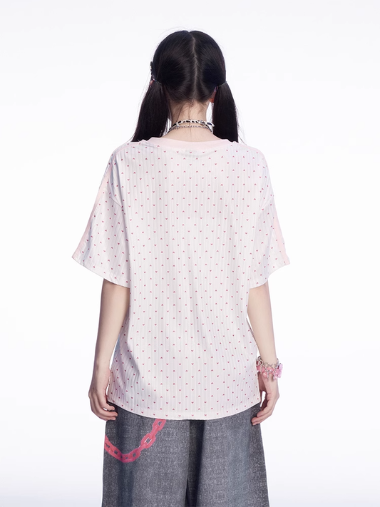 Pink Loose T-shirt V-neck Cartoon Girl Print Blokette Core