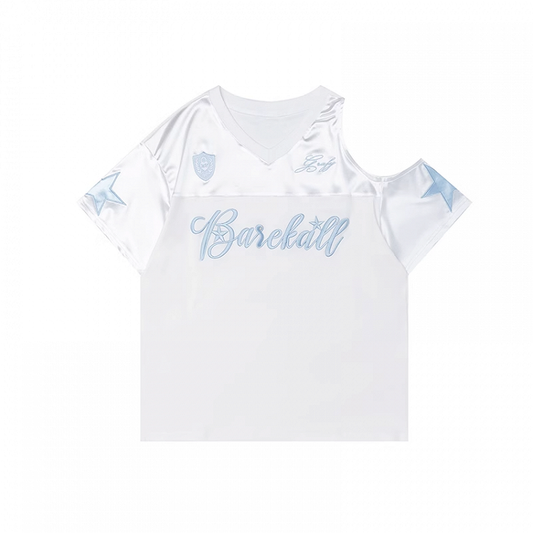 T-shirt White V-neck Cutout Shoulder Letter Embroidery Loose