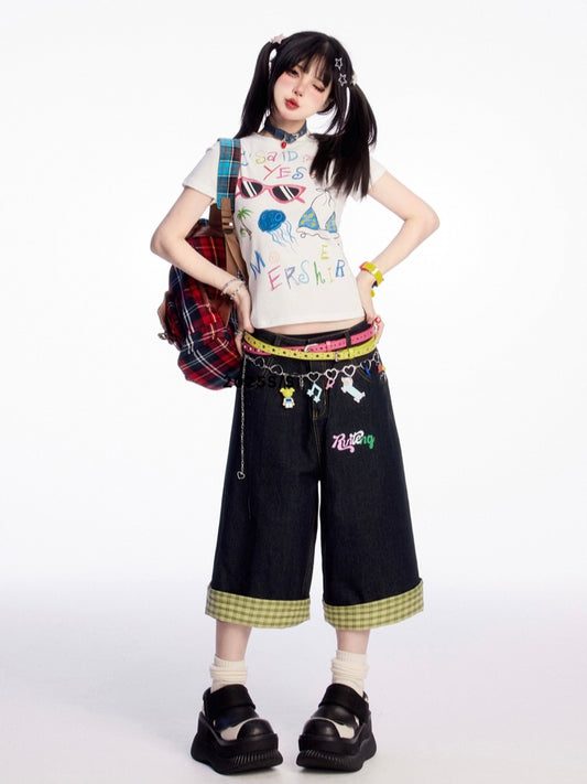 Black and Design Y2K Cartoon Print T-shirt Colorblock White