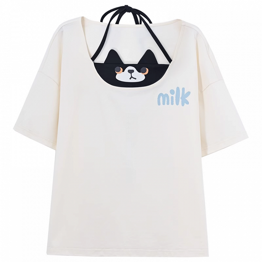 Cat T-Shirt Faux White Halter Neck Two-pieces