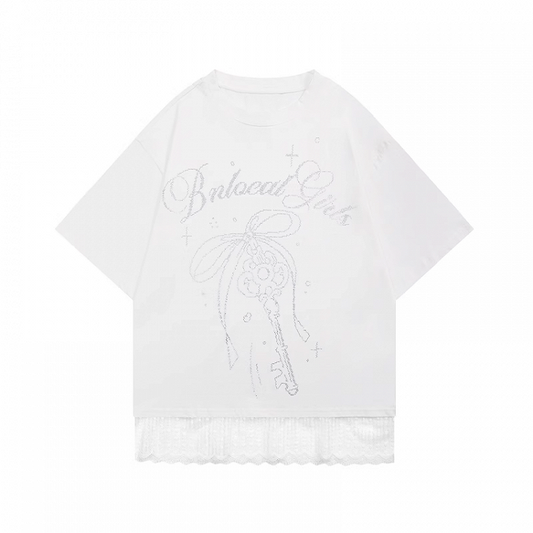 T-shirt Key Rhinestones Bowknot and Lace Trim White Round Neck
