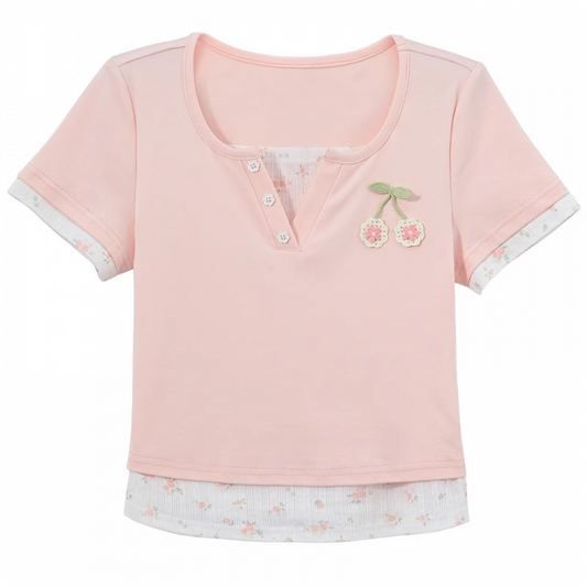 Faux Two-Pieces Pink Cherry Embroidery Sweet Floral T-Shirt