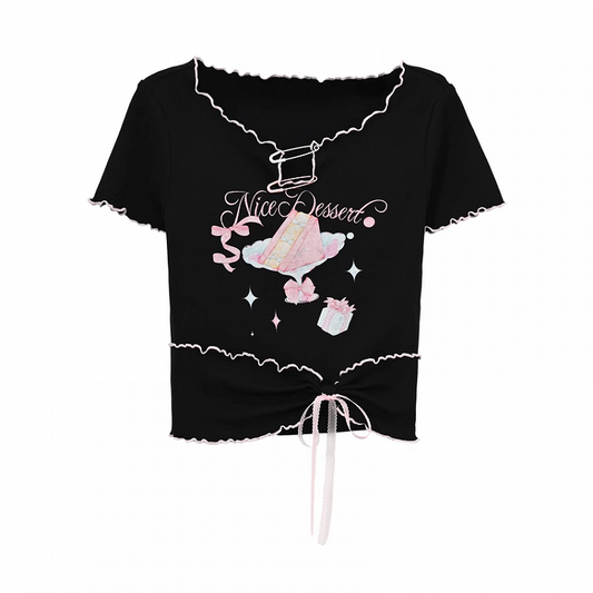 Neckline Black Cake Print Lettuce Hem Hem Pin Bow Big Details Sweet T-Shirt