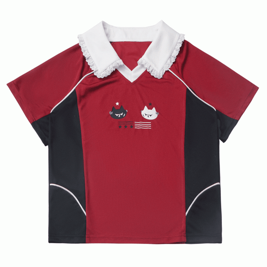 Red and Black Colorblock Pointed Flat Collar Kitten Print Blokette Core T-shirt Cute