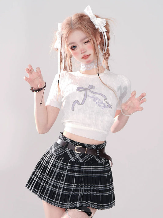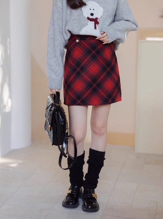 Check Rabbit Fur Mant + Tight Lace-Up Suspender Skirt