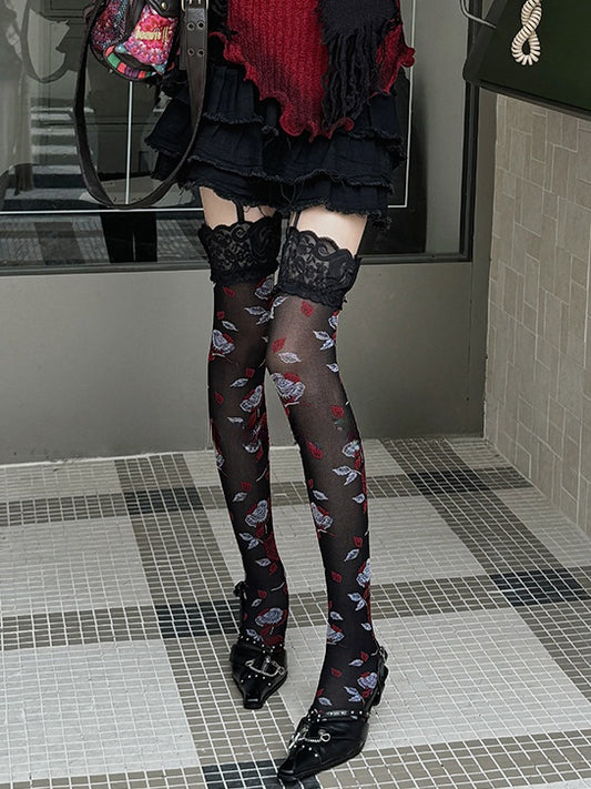 Grey/Black/Red Heart Print Bowknot Lace Trim Suspender Tights