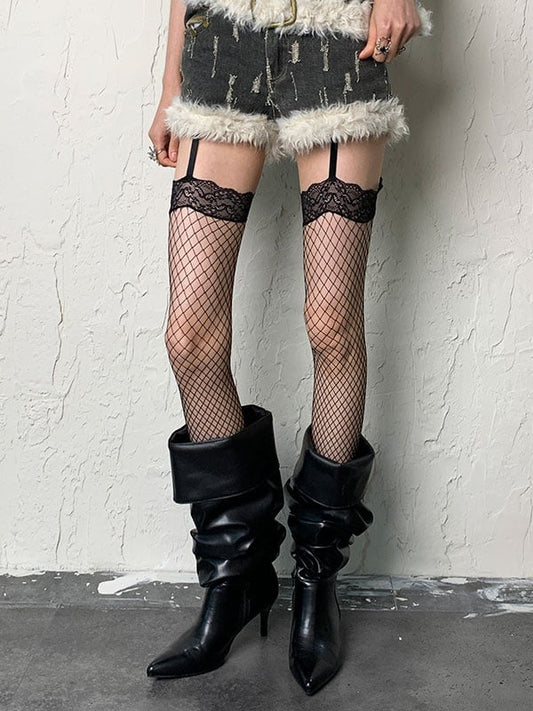 Punk Black Y2K Fishnet Suspender Tights With Red Lace Trim