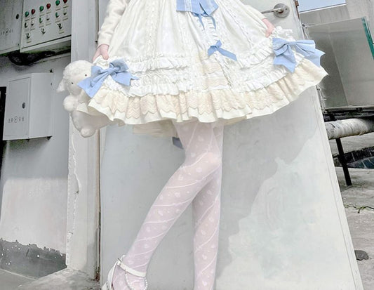 Trim Socks/Floral Cut-out Tulle Bowknot Design Stockings with Pattern Tights/White Lace Underknee Blue Fishnet