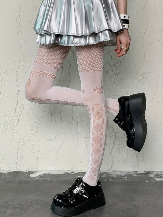 Pattern Tights Diamond Banded Crisscorss White Y2K