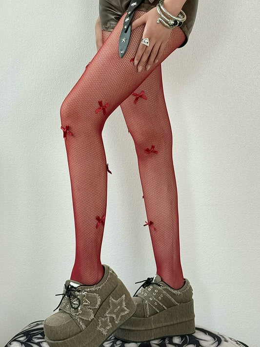 Fishnet Details Tights Bowknot Y2K Design Black