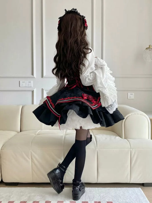 Black Striped Pattern Lolita Dress + Waistcoat + Cropped Top Full Set