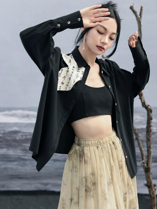 Velvet Dark Turtleneck Splicing Shirt Mesh Retro