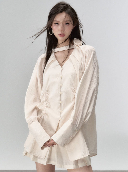 Color Sleep Frill Stand Volume Ribbon Shirt
