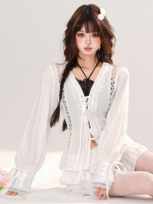 White Lace-up Placket V-neck Lace Blouse Balloon Sleeves