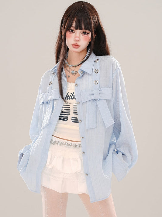 Blue Bowknot Details Loose Shirt