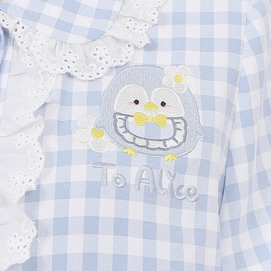 Little Penguin Blue Plaid Long Sleeves Blouse Lace Trim