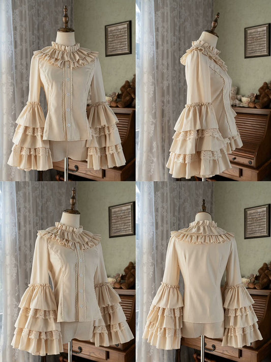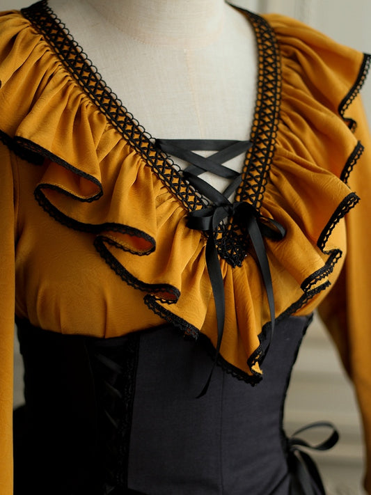 Ruffle Neckline Apricot Steampunk Balloon Sleeves Shirt