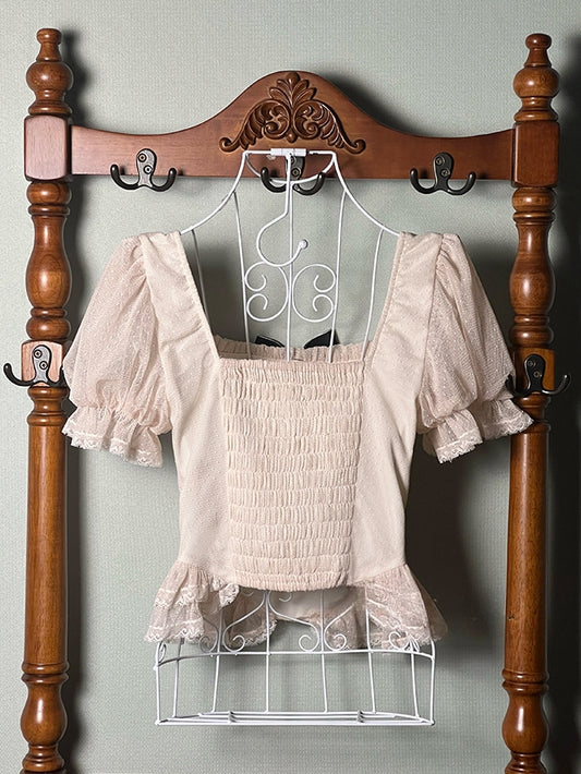 Beige Square Neckline Short Sleeves Blouse